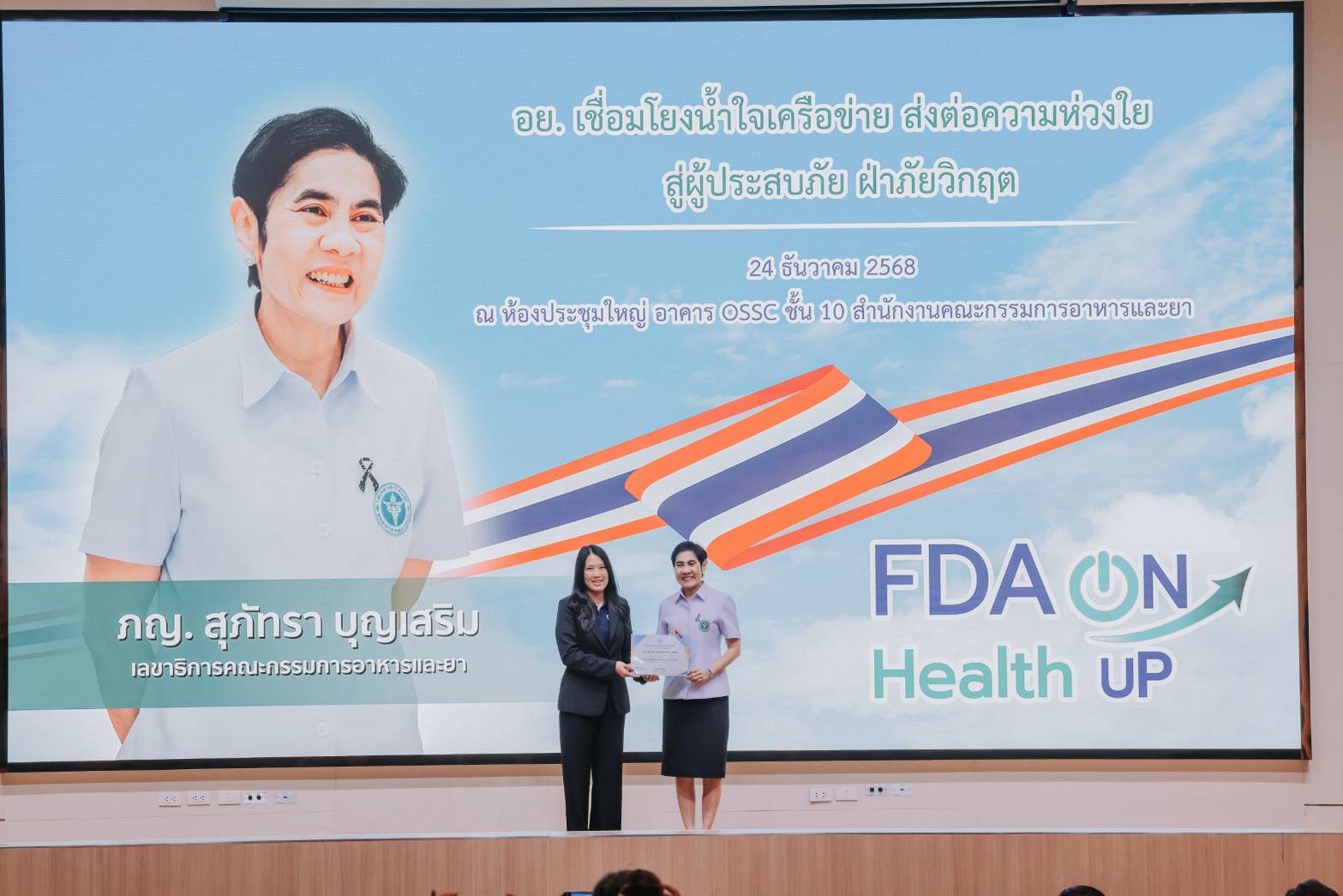 เมื่อวันที่ 24 ธันวาคม 2568 สำนักงานคณะกรรมการอาหารและยา (อย.) ได้จัดพิธีมอบประกาศเกียรติคุณ โดยได้รับเกียรติจาก เภสัชกรหญิงสุภัทรา บุญเสริม เลขาธิการคณะกรรมการอาหารและยา เป็นประธานในพิธี เพื่อยกย่ององค์กรภาคเอกชนที่มีบทบาทสำคัญในการสนับสนุนการช่วยเหลือผู้ประสบอุทกภัยในพื้นที่ภาคใต้