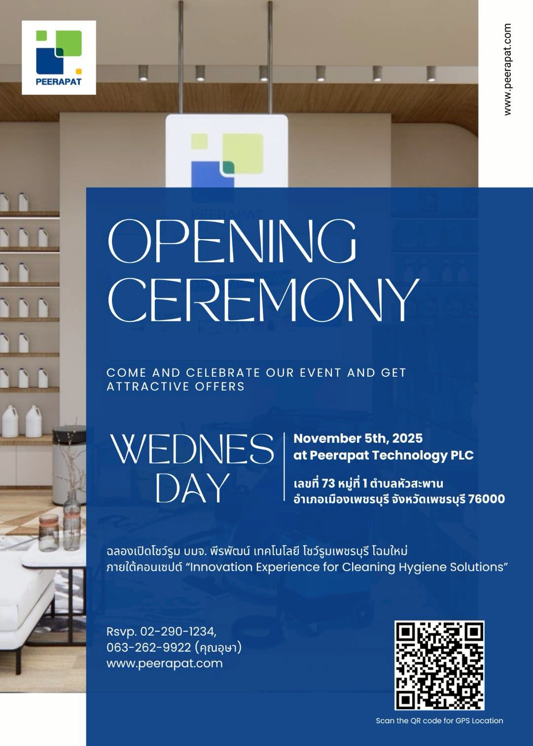 บมจ. พีรพัฒน์ เทคโนโลยี โชว์รูมเพชรบุรี ขอเรียนเชิญแขกผู้มีเกียรติทุกท่านร่วมงานเปิดตัวโชว์รูมใหม่(ย้ายจากโชว์รูมเดิม ณ อ.เขาย้อย) ไปยังสถานที่ตั้งใหม่ ณ อำเภอเมืองเพชรบุรี จังหวัดเพชรบุรี ซึ่งจะจัดขึ้นใน วันพุธ ที่ 5 พฤศจิกายน พ.ศ. 2568 เวลา 09:30 น. ถึง 15:00 น. ทั้งนี้ บริษัทฯ จัดพิธีทำบุญเจริญพระพุทธมนต์และถวายภัตตาหารเพลแด่พระสงฆ์ในวันและเวลาดังกล่าวเพื่อความเป็นสิริมงคลแก่บริษัทฯ